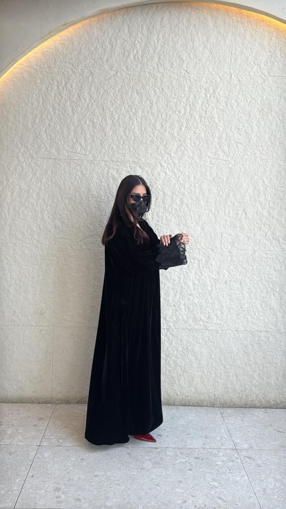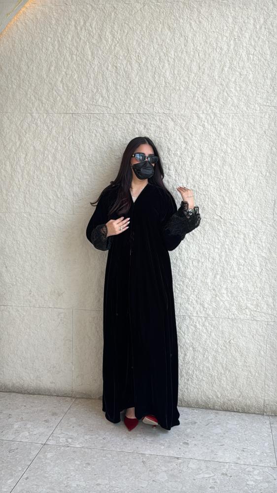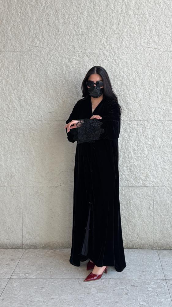 عباية من المخمل الأسود الناعم، بأكمام مطرزة بدقة تضيف جمال راقٍ بدون مبالغة. مثالية للظهور بأناقة ناعمة