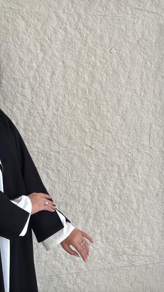 عباية أنيقة ومميزة تجمع بين فخامة الكتان الأسود ولمسة عصرية من قماش التيك توك الأبيض اللامع على الحواف. تصميم مريح وواسع بلمسة أنثوية ناعمة، مثالية للإطلالات اليومية أو المناسبات الخاصة.