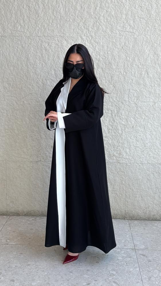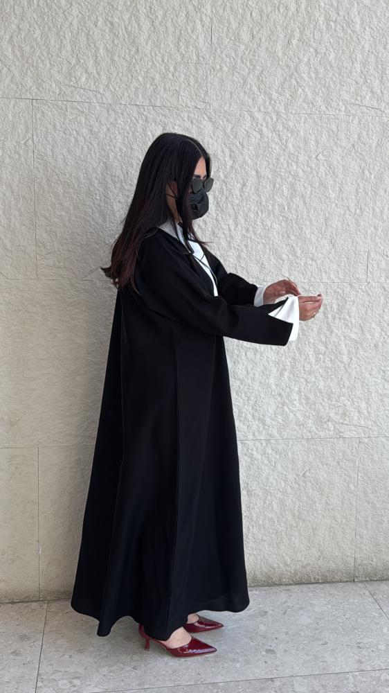 عباية كتان أسود بتفاصيل تيك توك أبيض